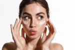 Beautiful_girls_773Close up beauty girl with freckles and thick eyebrows applying moisturizing skin care cream, lotion or mask for skin lifting and anti aging detox effect, white background.