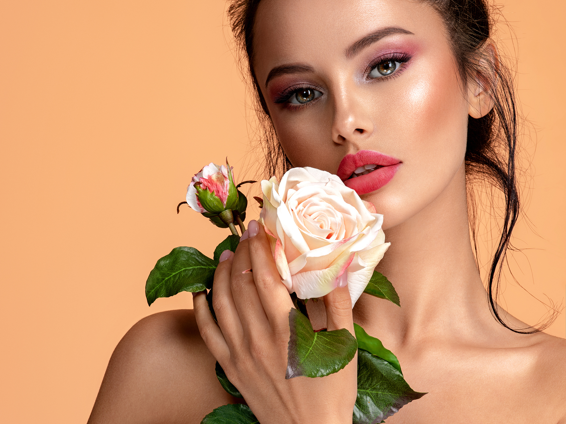Beautiful_girls_774Beautiful white girl with rose. Amazing brunette girl with white flower. Close-up face of a young beautiful woman with healthy clean skin. Pretty woman with bright makeup