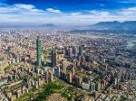 Aerial view of Downtown Taipei, capital city of Taiwan with view of prominent Taipei 101 Tower amid skyscrapers in Xinyi Financial District & overcrowded buildings in city center under sunny sky