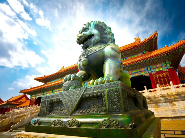 china_943 Statue of chinese guardian lion at forbidden city, beijing, china (palace museum) Date: 2/15/2023 Statue of chinese guardian lion at forbidden city, beijing, china (palace museum)