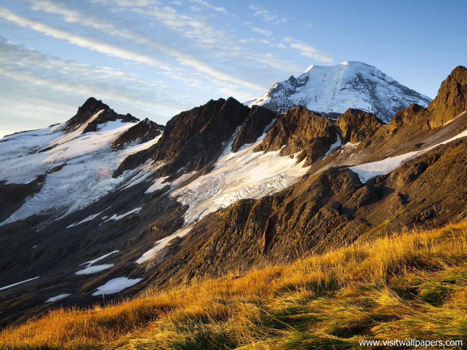 Mount Rainier washed in golden hour sunshine during a summer sunset