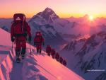 mountains_405Hikers in heavy winter gear and backpacks ascend Mount Everest's snowy slopes in the soft morning light, surrounded by majestic Himalayan peaks and serene valleys.