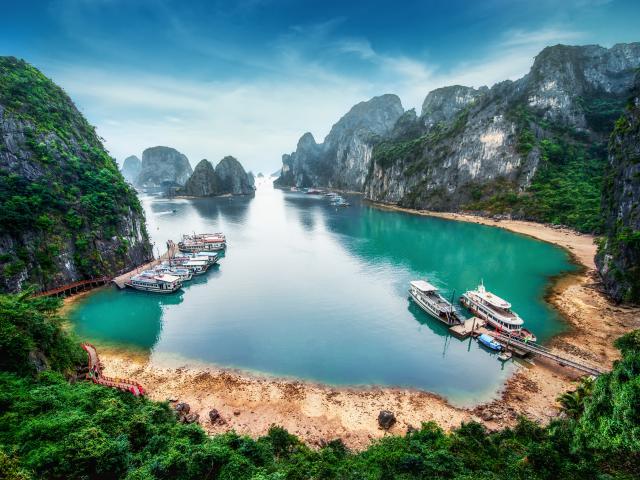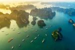 vietnam_005Aerial view of floating fishing village and rock island, Halong Bay, Vietnam, Southeast Asia. UNESCO World Heritage Site. Junk boat cruise to Ha Long Bay. Popular landmark, famous destination of Vietnam