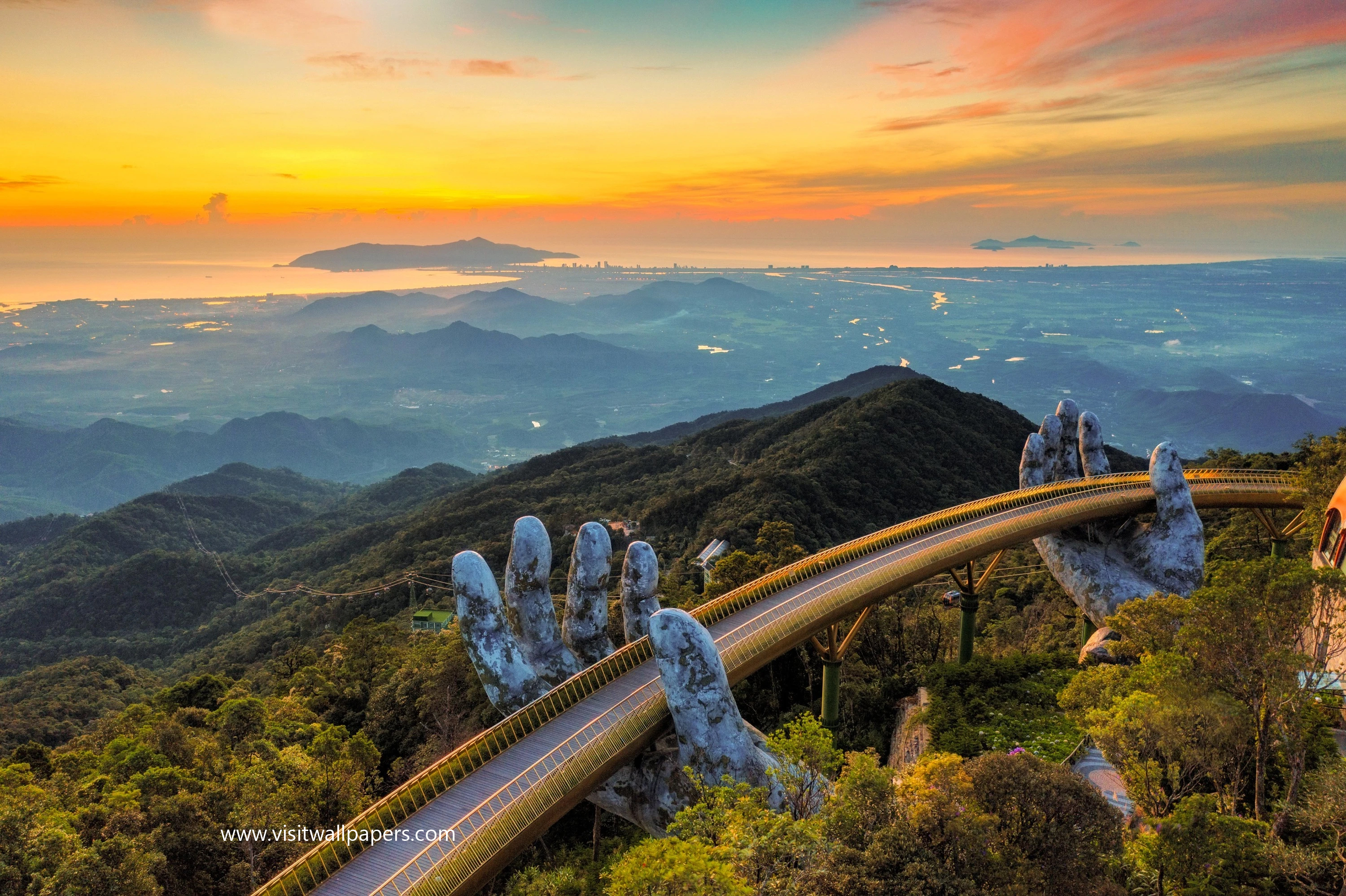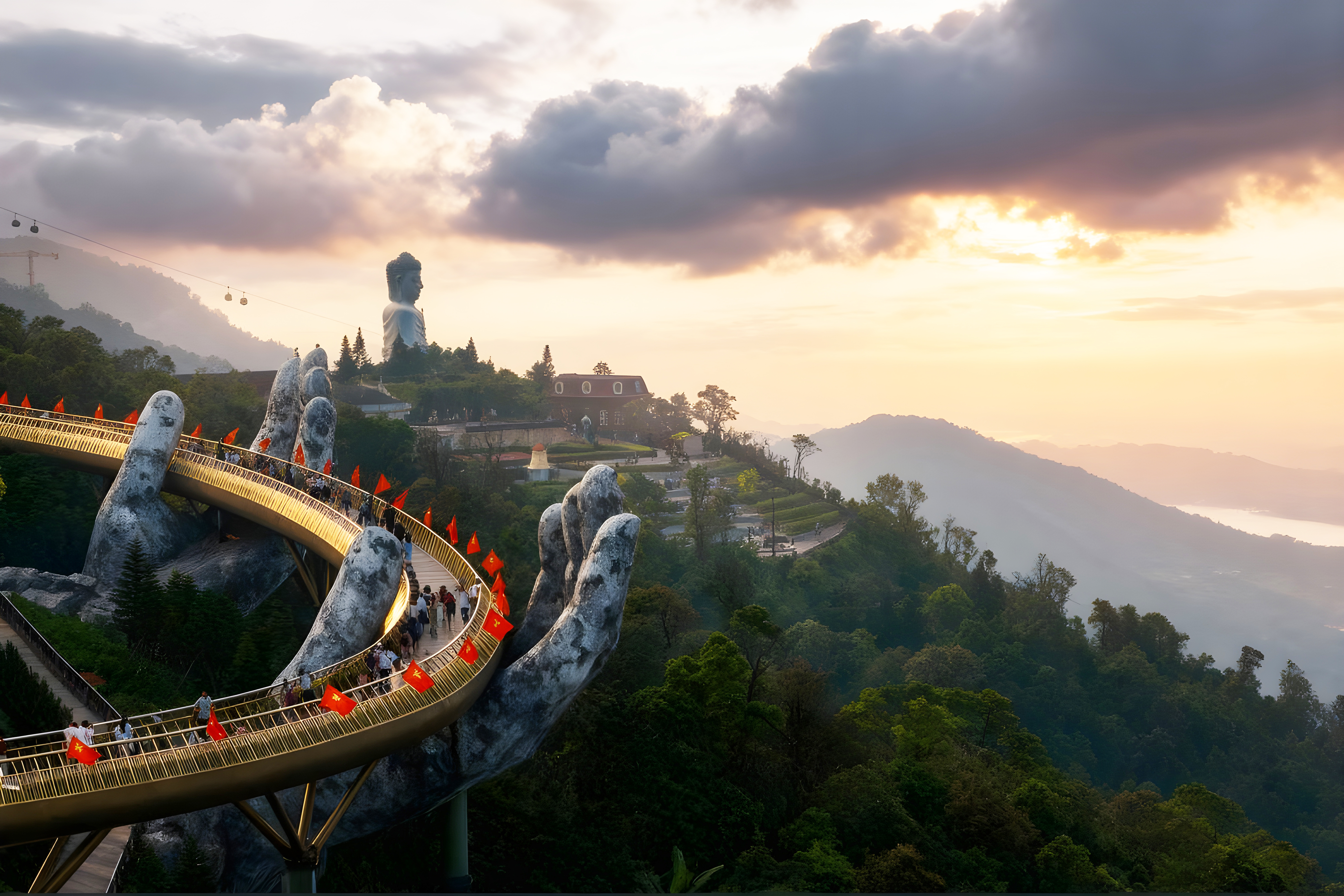 vietnam_056Da Nang, Vietnam - March 27 2025: Majestic ba na hills golden bridge at sunset. The Golden Bridge is a 150-metre-long (490 ft) pedestrian bridge in the Bà Nà Hills resort, in the Hòa Vang district of Da Nang, Vietnam. It is designed to connect the c