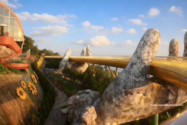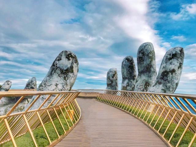 The Golden Bridge is a 150-metre-long (490 ft) pedestrian bridge in the Bà Nà Hills resort, in the Hòa Vang district of Da Nang, Vietnam. It is designed to connect the cable car station with the gardens (avoiding a steep incline) and to provide a scenic overlook and tourist attraction. The bridge loops nearly back around to itself and has two giant hands, constructed of fibreglass and wire mesh, designed to appear like stone hands that support the structure.