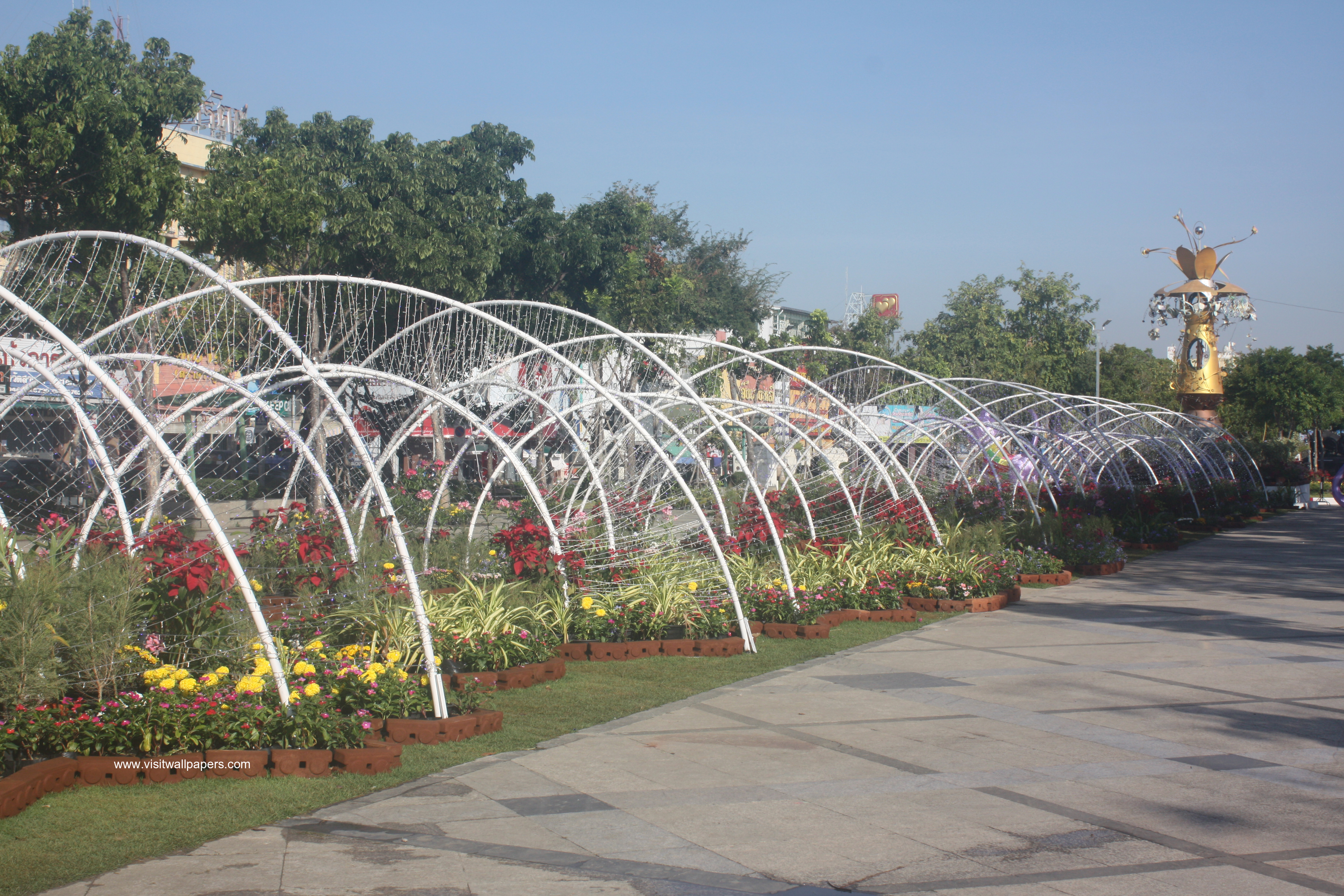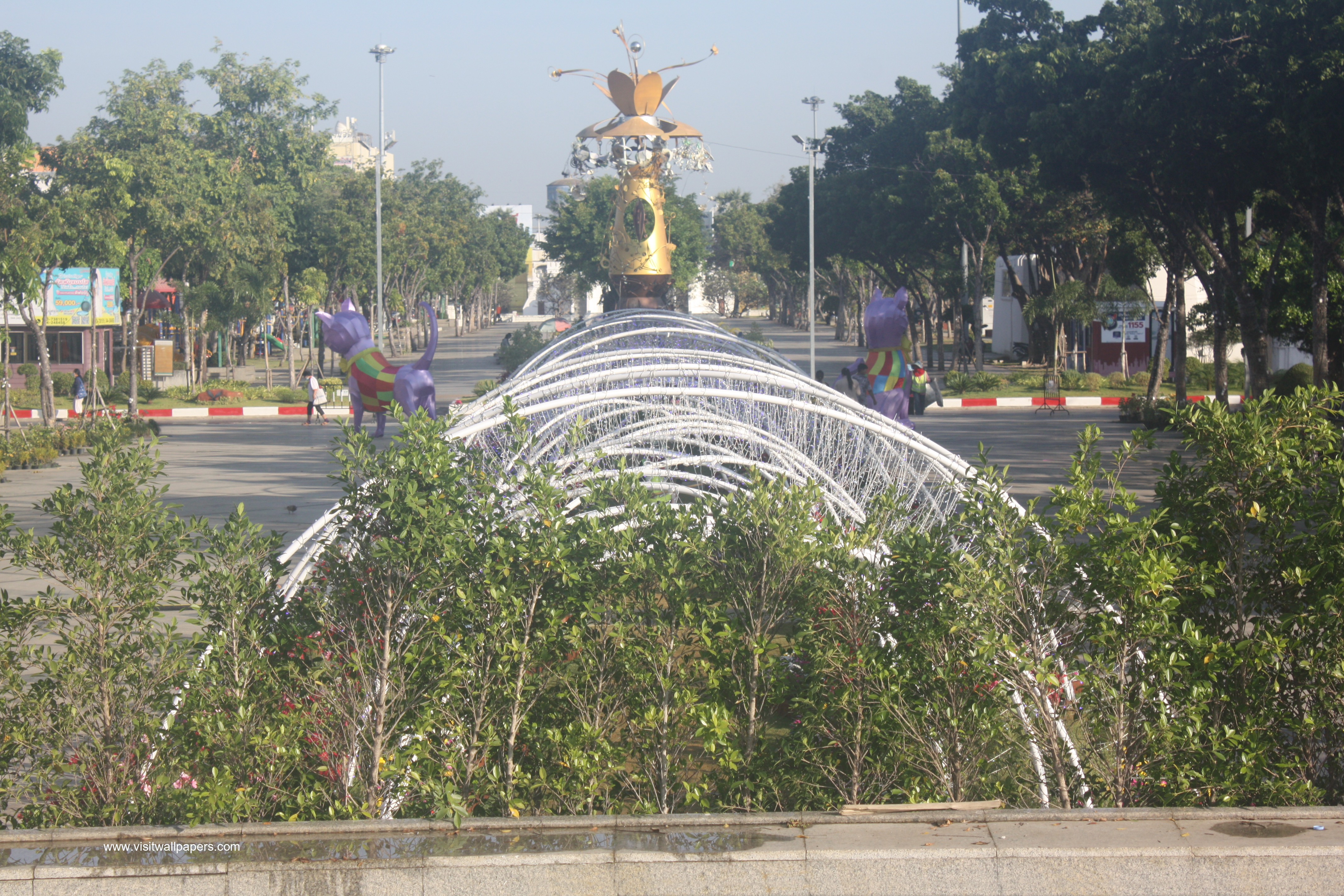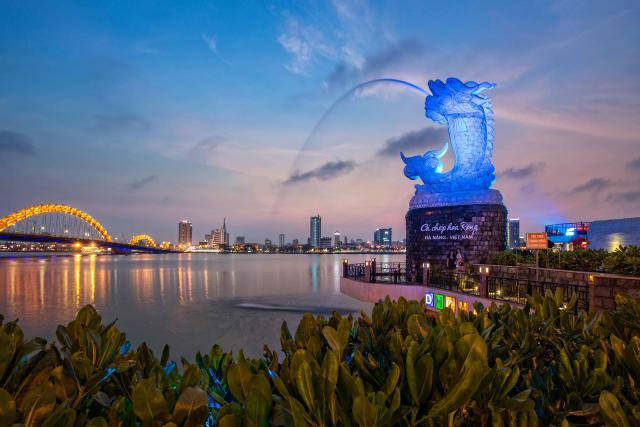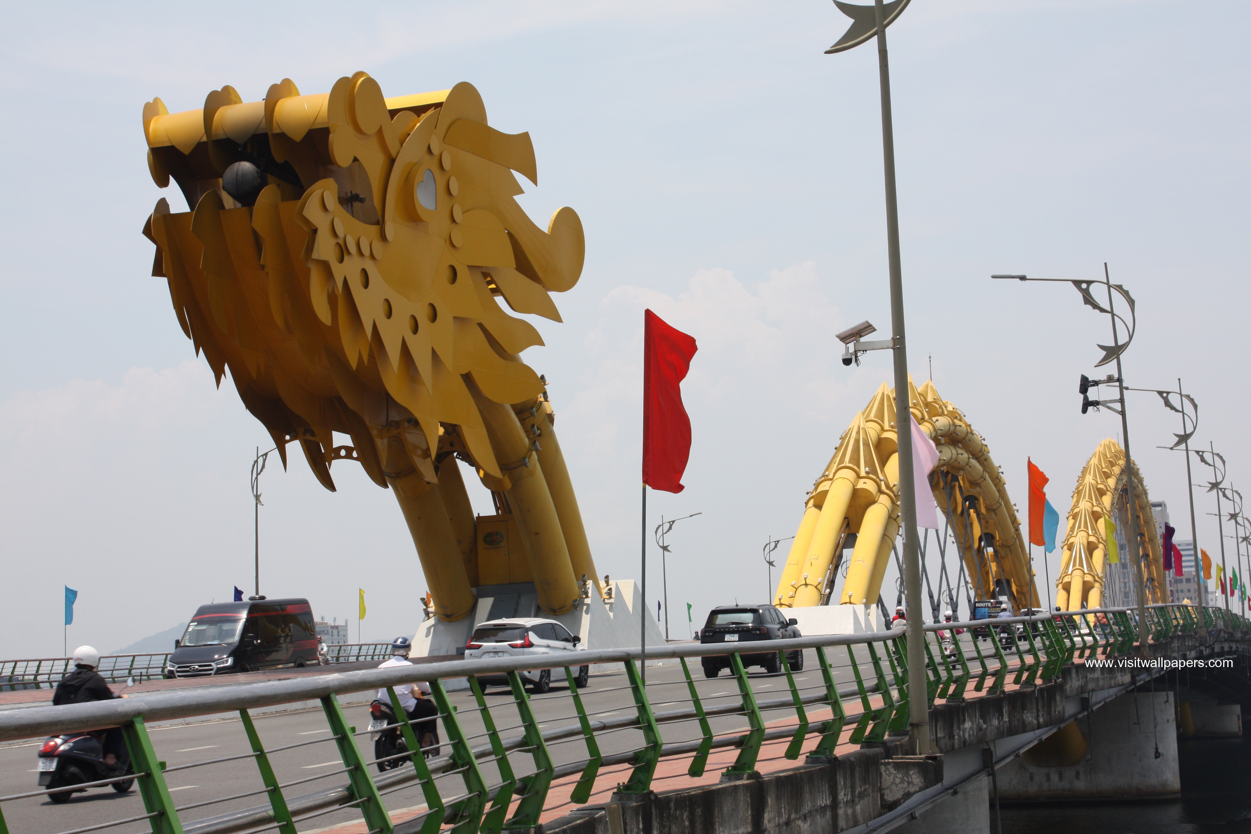 This modern bridge crosses the Han River at the Le Dinh Duong/Bach Dang traffic circle, providing the shortest road link from the Da Nang International Airport to other main roads in Da Nang city, and a more direct route to My Khe Beach and Non Nuoc Beach on the eastern edge of the city. The bridge was designed and built in the shape of a dragon and to breathe fire and water each Saturday and Sunday night at 9 pm.