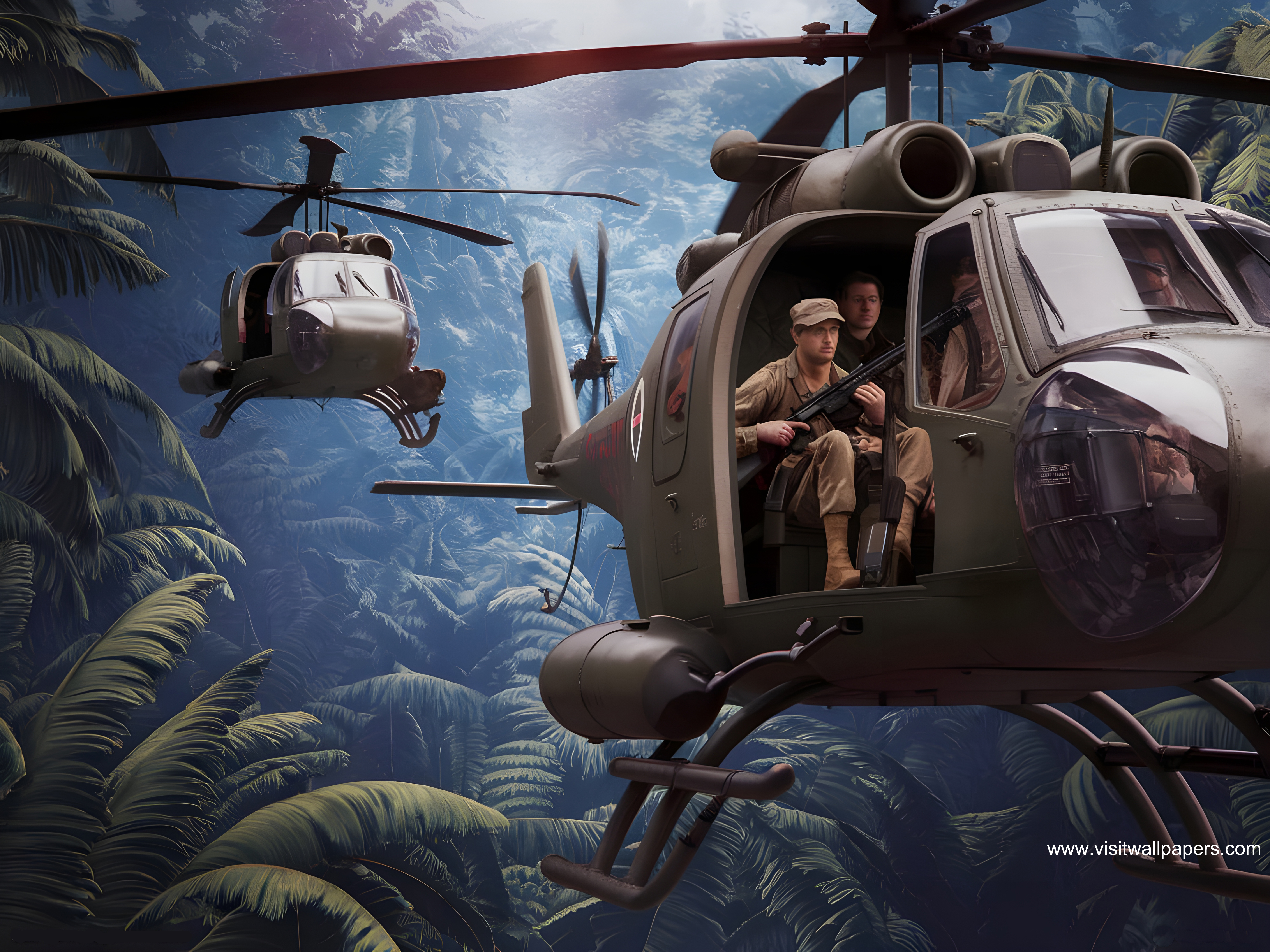 Helicopters on the background of the jungle of Vietnam. Vietnam war.
