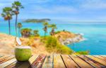 thailand_138Coconut juice on wood table with Phromthep cape in the background, beautiful andaman sea view in Phuket island in summer, Thailand. Summer holiday concept