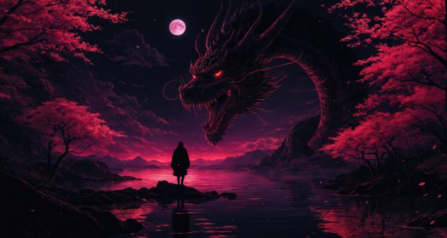 Fantasy_448A samurai woman with long hair, wearing an ancient Japanese costume, Her body is toned and lithe, and holding a sword in her hand in a dynamic pose, is surrounded by a background of a dragon pattern. the color scheme is dark red.