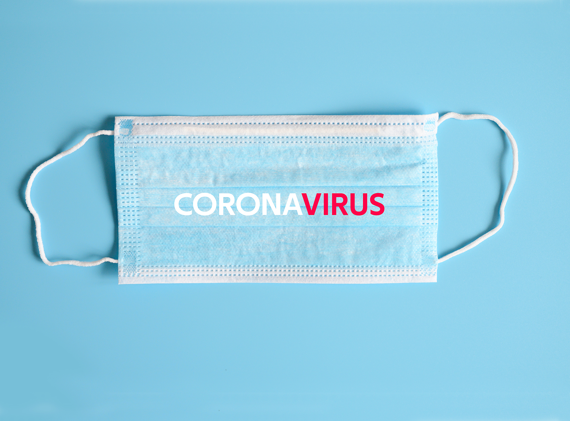 blue_051Medical protective disposable blue mask with CORONAVIRUS text. concept protection of outbreak novel dangerous 2019-nCoV influenza coronavirus ( COVID-19 ), mutated and spreading in China and Wuhan. blue background.