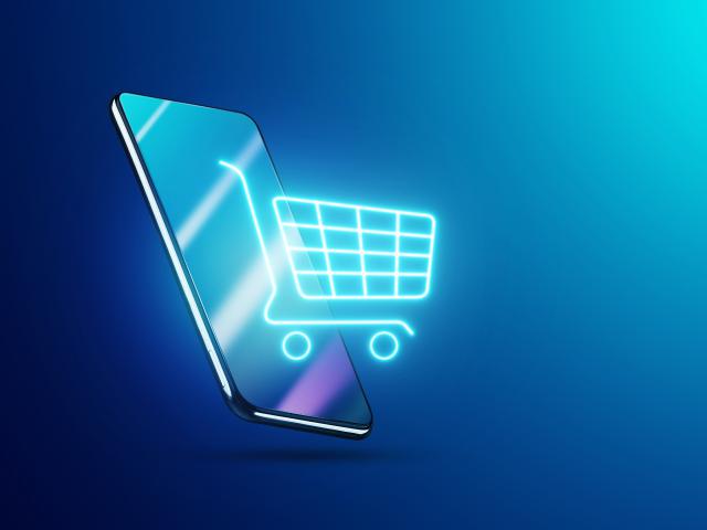 blue_059Phone and basket hologram. Online shopping, online store application in a smartphone. Digital Marketing Online. 3D illustration, 3D render
