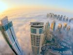 Dubai_138 Downtown Dubai with skyscrapers submerged in thick fog. Picture taken from unique view. Tall buildings. Early morning glow. Date: 3/25/2024 Downtown Dubai with skyscrapers submerged in thick fog. Picture taken from unique view. Tall buildings. Early morning glow.