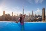 Dubai_121 Beautiful young woman enjoys the panoramic view from an infinity pool on downtown Dubai Date: 12/3/2021 Beautiful young woman enjoys the panoramic view from an infinity pool on downtown Dubai