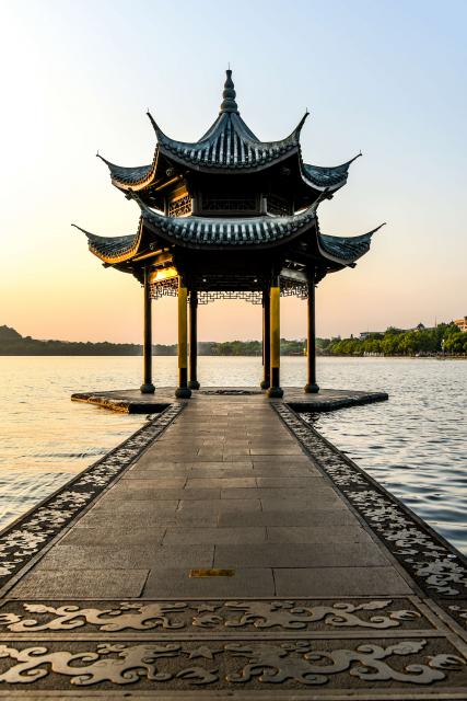 china_929 Jixian pavilion in hangzhou during sunset.the chinese word in photo means"Jixian pavilion".chinese ancient pavilion on the west lake in hangzhou.West Lake of the most famous scenic spots in China. Date: 5/17/2022 Jixian pavilion in hangzhou during sunset.the chinese word in photo means"Jixian pavilion".chinese ancient pavilion on the west lake in hangzhou.West Lake of the most famous scenic spots in China.