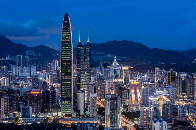 china_936 Shenzhen Futian district skyline at dusk, view Shenzhen CBD and financial district landmark buildings Date: 8/15/2022 Shenzhen Futian district skyline at dusk, view Shenzhen CBD and financial district landmark buildings