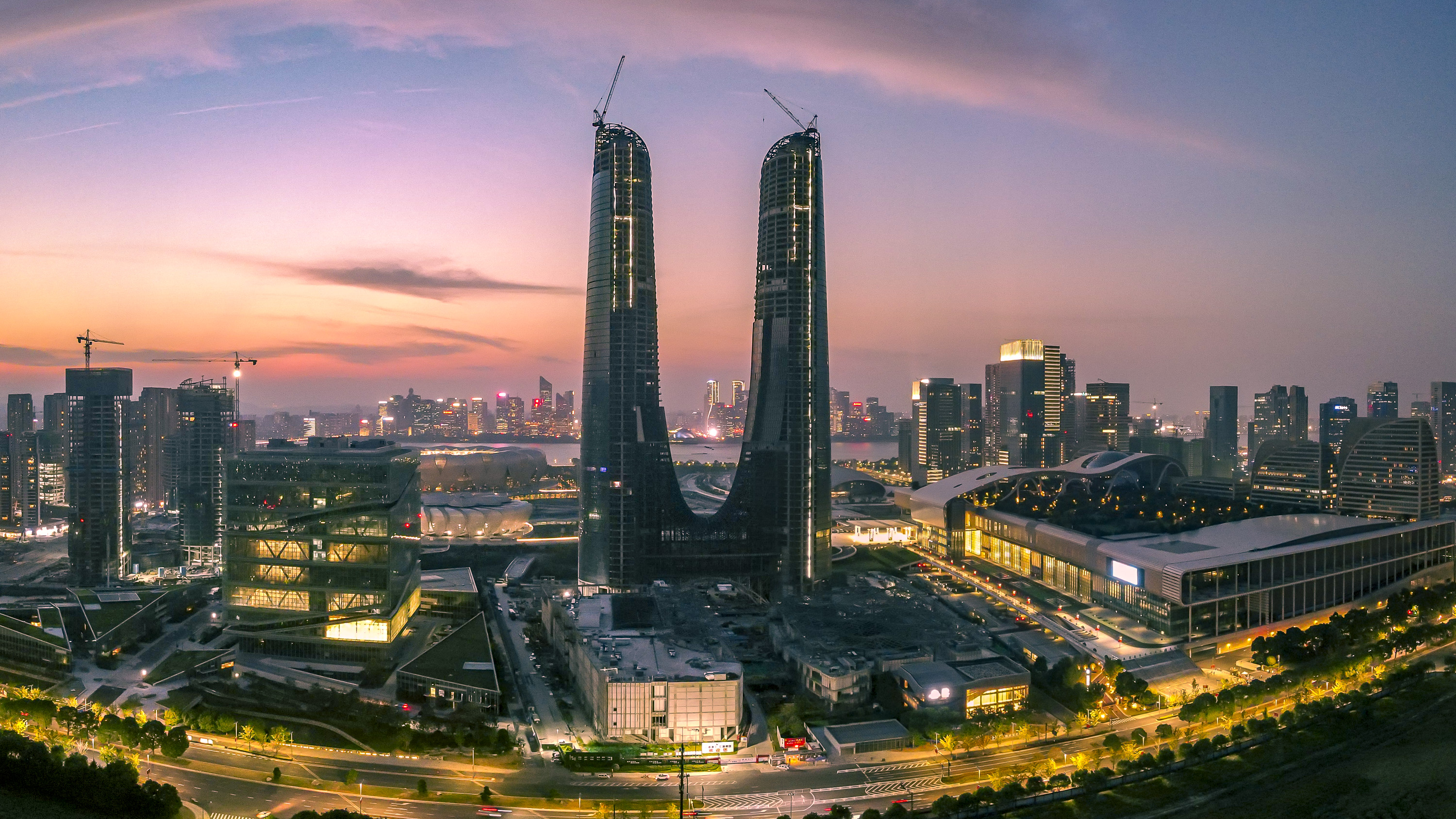 china_960 Greenland Hangzhou Center, also known as "Hangzhou Gate", comprises of two towers of about 310m high and a commercial podium. The iconic design presents a unique "H" shape, which is derived from the first letter of the city's name. It Date: 9/19/2023 Greenland Hangzhou Center, also known as "Hangzhou Gate", comprises of two towers of about 310m high and a commercial podium. The iconic design presents a unique "H" shape, which is derived from the first letter of the city's name. It is currently the tallest building in Hangzhou, China.