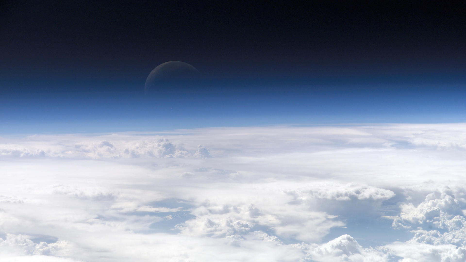 Space transportation in near-Earth space. Clouds and sky in the background. Atmosphere. Elements of this image provided by NASA