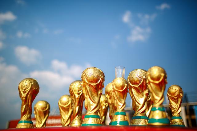 Fifa world cup 2022 celebration winning trophy with stadium. 3d rendering illustration.