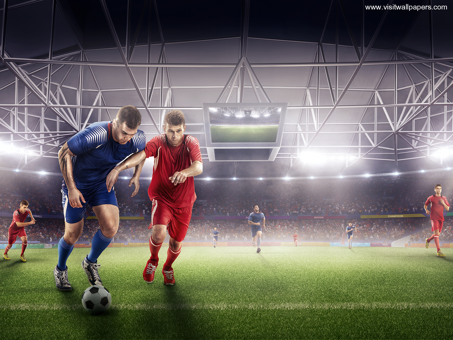 soccer_90Two soccer players in action fighting for a ball. Soccer stadium with tribunes, illuminations and spectators.