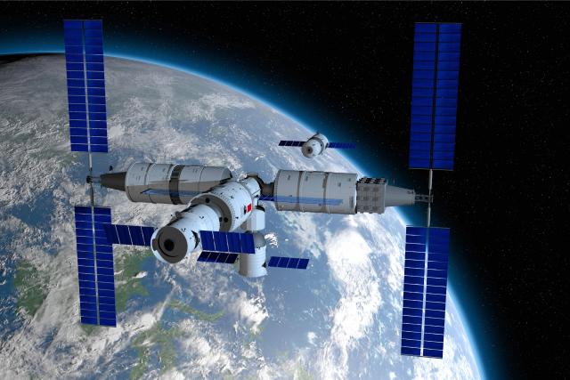 sci-fi_111Shenzhou manned space vessel in the direction of coupling to the TIANHE core module in TIANGONG 3 - Chinese space station with the planet Earth behind on black space background. 3D Illustration
