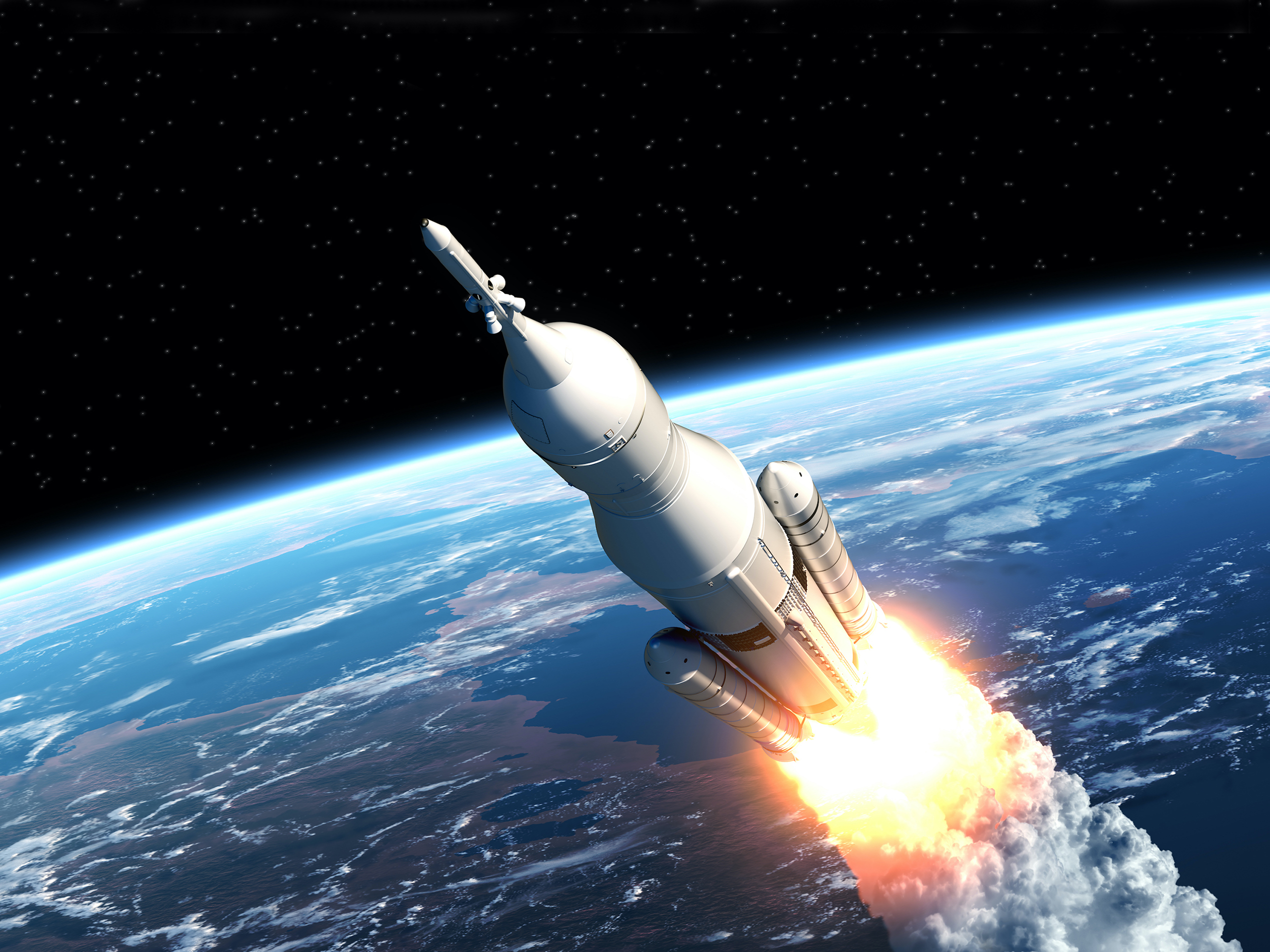 sci-fi_100Space Launch System Flying Over The Clouds. 3D Scene.