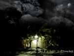 low key image of UFO hovering over a forest at night