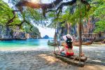 Woman in bikini relaxing on swing at Ko lao lading island, Krabi, Thailand.