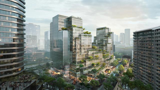 Among the most striking among is Urban Glen, a pair of dramatically stepped towers containing nearly 900,000 square feet of office, hotel and leisure space in the eastern city of Hangzhou. Like the hills surrounding Hangzhou on three sides, the two volumes — one of which houses a Rosewood Hotel — appear to cascade into a manmade valley of roof terraces, shops and public art.