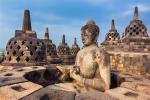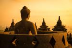 Indonesia_169Amazing sunrise view of meditating Buddha statue and stone stupas against shining sun on background. Ancient Borobudur Buddhist temple. Great religious architecture. Magelang, Central Java, Indonesia