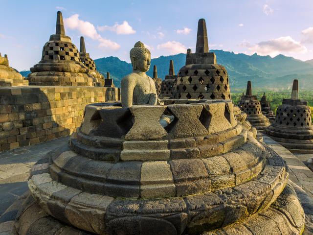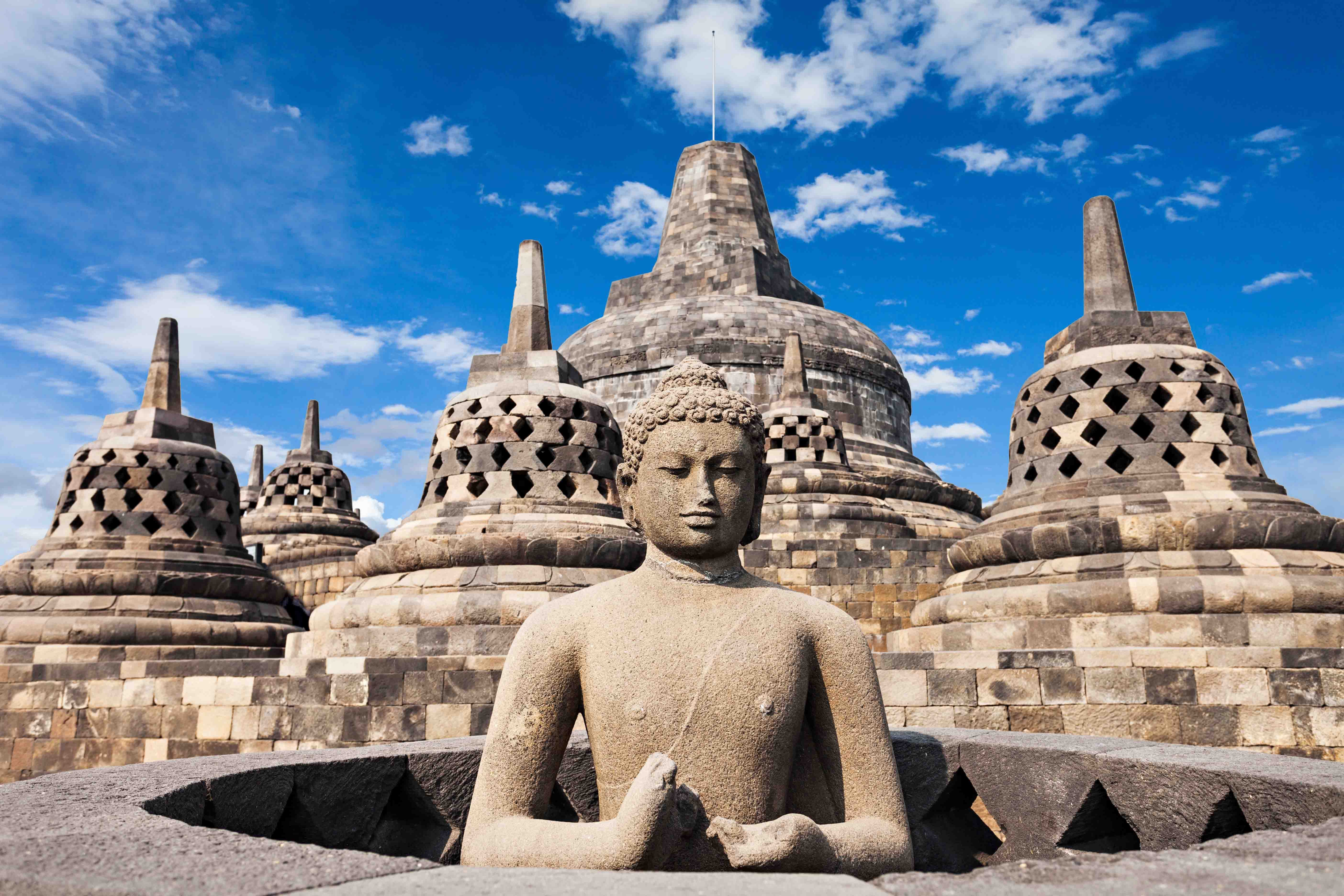 Indonesia_164Amazing view of ancient Borobudur Buddhist temple with meditating Buddha statue carved from dark stone against blue sky on background. Great religious architecture. Magelang, Central Java, Indonesia