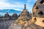 Indonesia_141Candi Borobudur in the background of the rainforest, morning mist and Sumbing Mountain. Candi Borobudur, Yogyakarta, Jawa, Indonesia.
