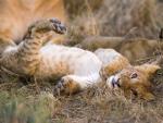 Two small baby lions running at full speed near river in Ndutu, Tanzania.