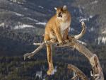 Cougar_16COUGAR MOUNTAIN LION PANTHER Cougar also called Mountain Lion, Panther or Puma crossing a log at a frozen pond in winter, Colorado, USA