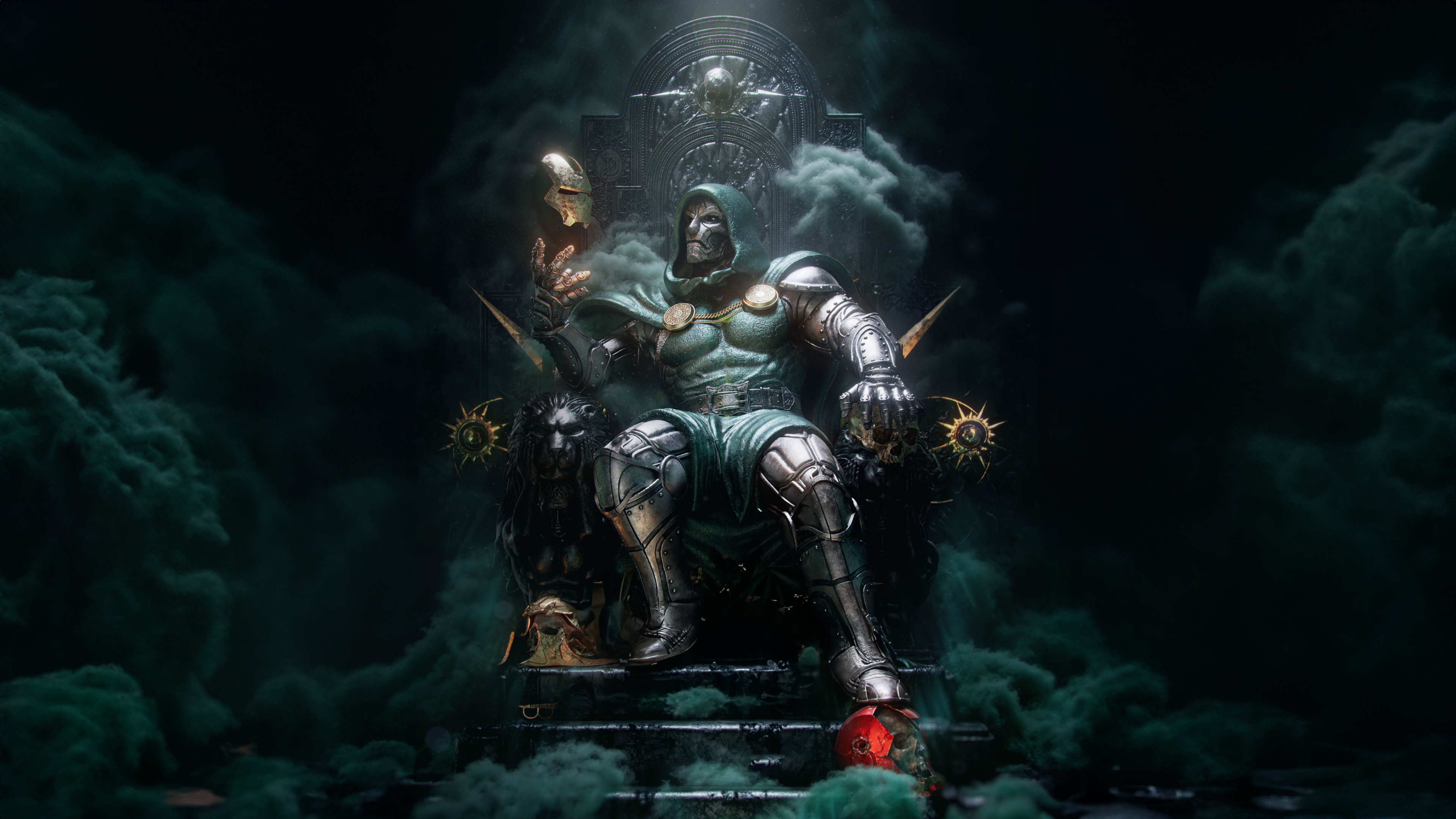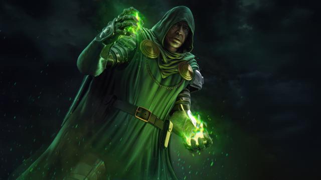 marvel_345 Victor von doom vs Iron Man : Marvel Comics Wallpaper Doctor Doom in dark green cloak and metallic armor, Iron Man in sleek red and gold suit, stand in tense standoff on devastated futuristic battlefield, surrounded by glowing energy, lightning, and s Date: 7/21/2025 Victor von doom vs Iron Man : Marvel Comics Wallpaper