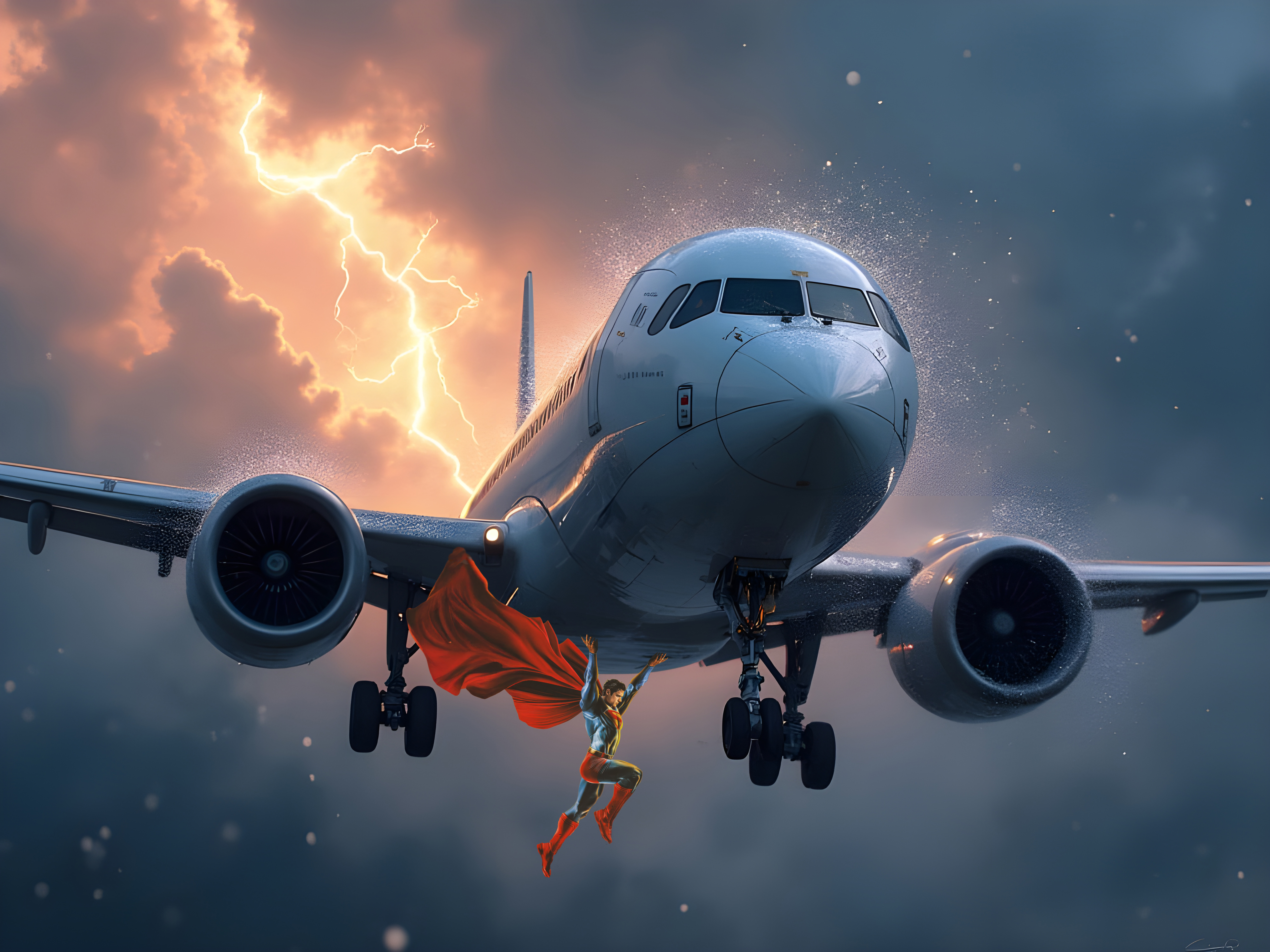 superman_172Superman intercepts a plummeting airbus A220-100 airplane flying through a fierce hailstorm.
