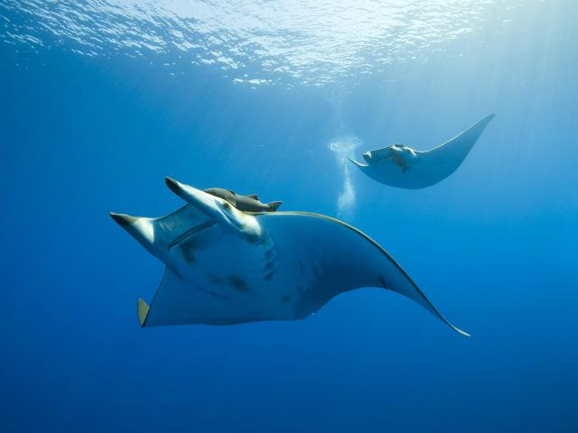 ocean-life-740Manta ray filter feeding above a coral reef in the blue Komodo waters