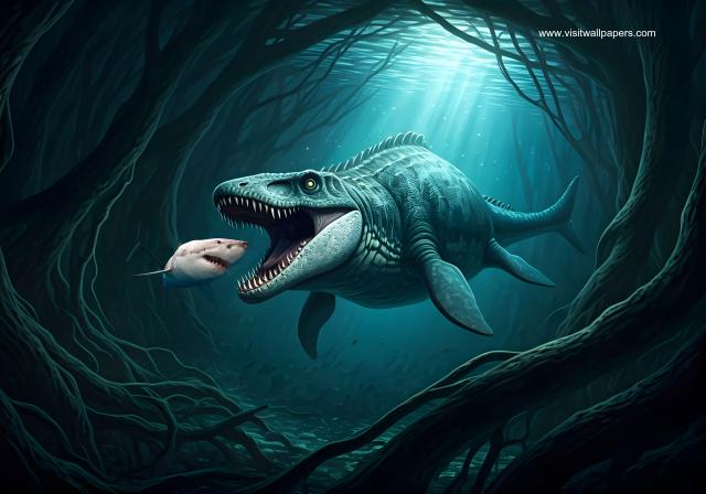 ocean-life-829Mosasaurus with bulky skull and muscular build, jaws agape, poised to snap up a shark, glides through dark, alien ocean depths, bioluminescent eyes glowing, surrounded by shimmering turquoise water and eerie and twisted tree roots.