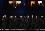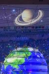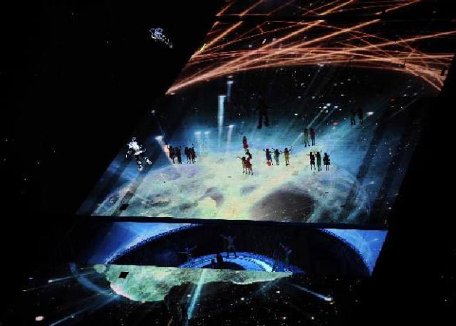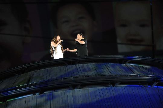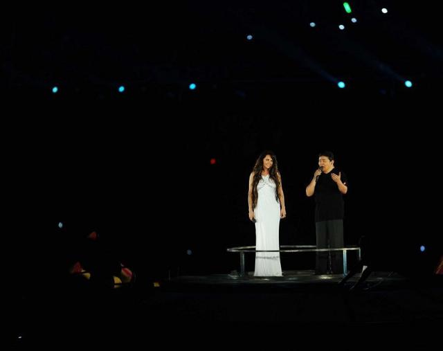 The Chinese singer Liu Huan and British singer Sarah Brightman, standing on the central platform, sang the 2008 Olympic theme song: You