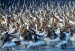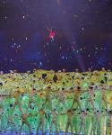 a troupe of female dancers dressed in Tang-era clothing entered, suspended by a rectangular extension held by hundreds of performers. On the ground was the map of the Silk Road.