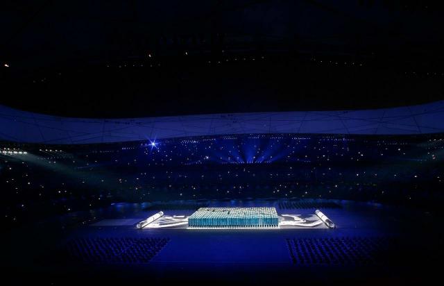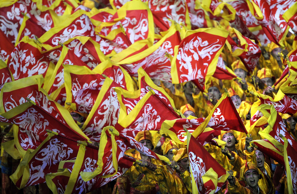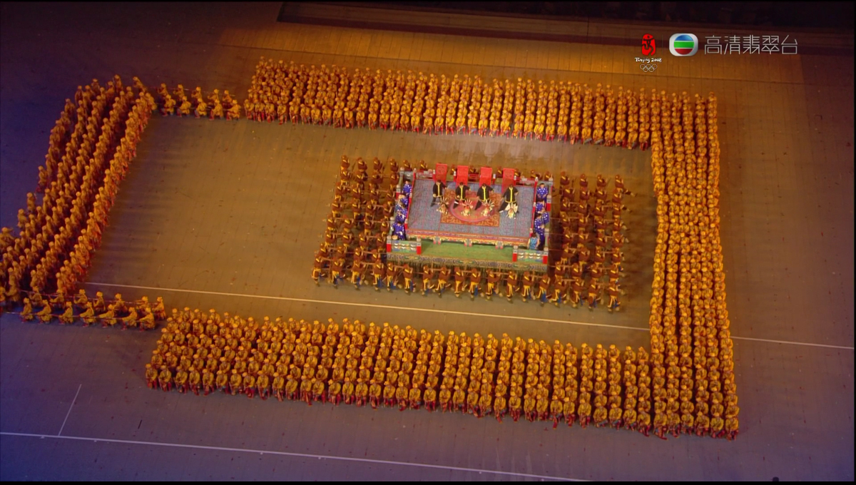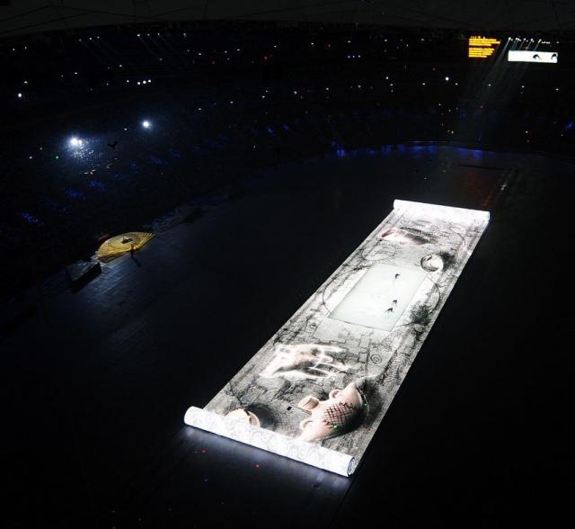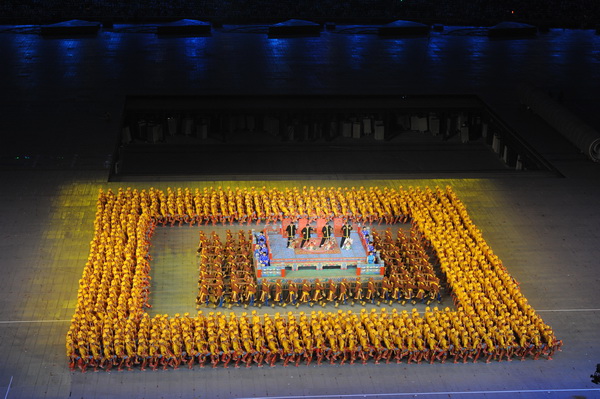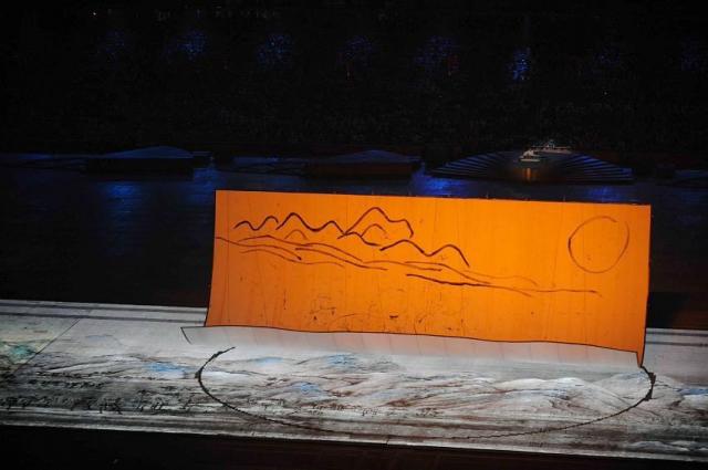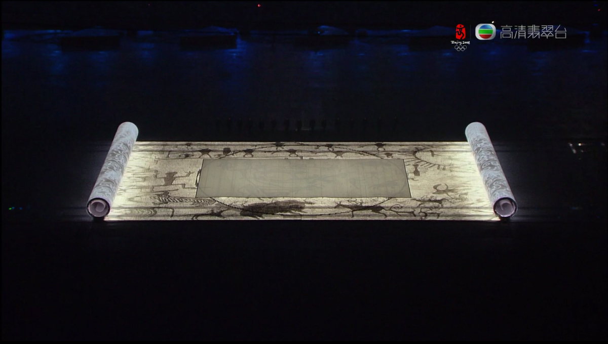 ม้วนกระดาษขนาดใหญ่ปรากฏกลางสนามพร้อมกับคลี่ออกอย่างช้าๆ และฉายภาพเครื่องถ้วยโบราณของจีน ส่วนตรงกลางของม้วนกระดาษเป็นผืนผ้าใบซึ่งมีนักแสดงที่แต่งชุดดำและทาหมึกไว้ทั่วตัวกลิ้งตัวไปมาเป็นรูปท้องฟ้า ภูเขา และดวงอาทิตย์ สื่อให้เห็นถึงการเขียนภาพด้วยหมึกจีน