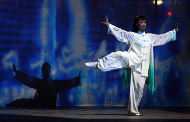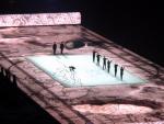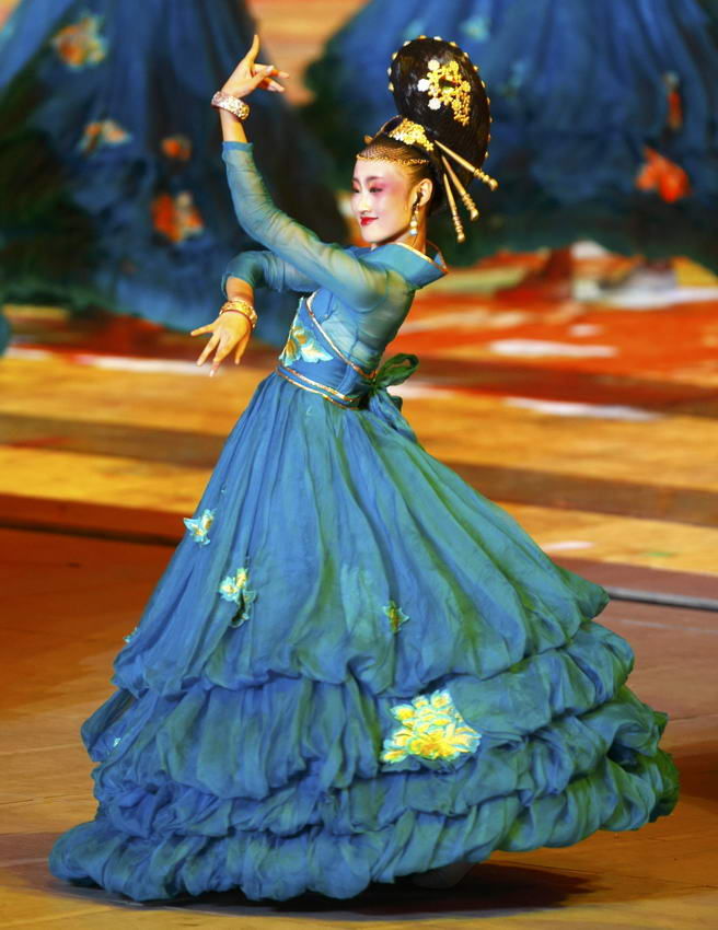 การแสดง kunqu ซึ่งเป็นงิ้วประเภทหนึ่ง มีผู้แสดงชายหนึ่งคน หญิงหนึ่งคน ยืนร้องเพลงบนผืนผ้าใบ จากนั้น เหล่านางระบำในชุดสมัยราชวงศ์ถังก็เข้าสู่สนาม พร้อมกับมีแท่นที่มีนักแสดงชายถือพิณจีน จำนวน 14 แท่น และแท่นเหล่านั้นได้ยกขึ้นเป็นเสาคล้ายเสามังกรในพระราชวังต