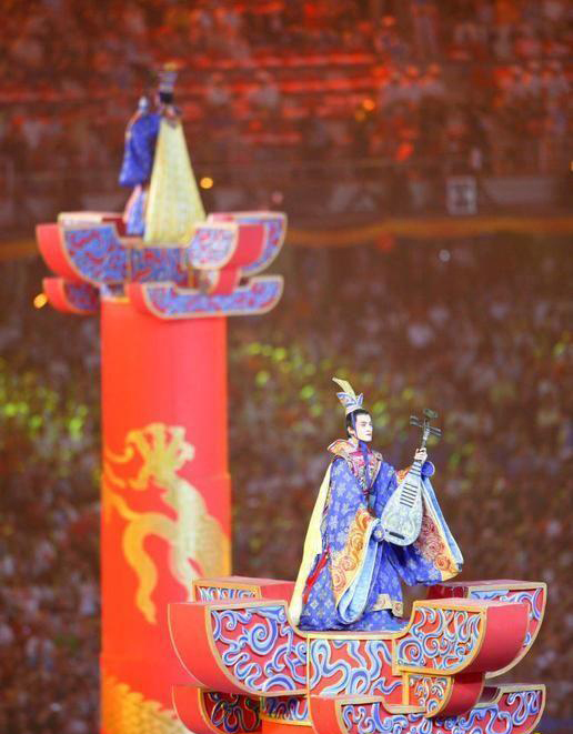 การแสดง kunqu ซึ่งเป็นงิ้วประเภทหนึ่ง มีผู้แสดงชายหนึ่งคน หญิงหนึ่งคน ยืนร้องเพลงบนผืนผ้าใบ จากนั้น เหล่านางระบำในชุดสมัยราชวงศ์ถังก็เข้าสู่สนาม พร้อมกับมีแท่นที่มีนักแสดงชายถือพิณจีน จำนวน 14 แท่น และแท่นเหล่านั้นได้ยกขึ้นเป็นเสาคล้ายเสามังกรในพระราชวังต้องห้าม (huabiao (华表))