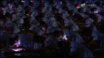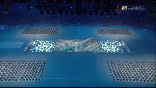 a troupe of female dancers dressed in Tang-era clothing entered, suspended by a rectangular extension held by hundreds of performers. On the