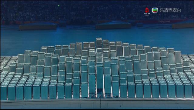 The giant scroll was then moved aside to show a fluid array of 897 movable type blocks that formed three variations of the character 和 (harmony)