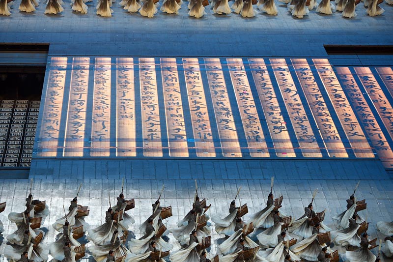 Chinese paper artifacts were beamed on a giant scroll slowly unfurling. At its center was a piece of white canvas paper, which then ushered in a performance of black-costumed dancers whose hands hid brushes that had been dipped in ink. They performed a dance while leaving their trails on the block of white paper, reminiscent of Chinese ink and wash art.
