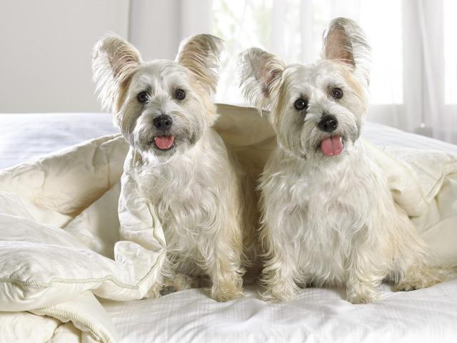 dog_539 Two dogs lying on pillows on bed, Jack Russell Terrier and Nova Scotia Duck Tolling Retriever. Date: 8/2/2023 Two dogs lying on pillows on bed, Jack Russell Terrier and Nova Scotia Duck Tolling Retriever.