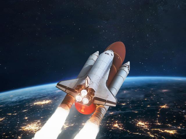 Space shuttle launch in the open space over the Earth. Ocean and sky under space ship. Elements of this image furnished by NASA