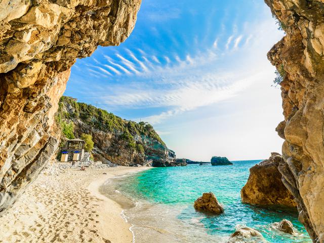 Beaches_125 Beautiful view over the sea beach in Corfu island, Pelion, Mylopotamos, Greece Date: 4/8/2020 Beautiful view over the sea beach in Corfu island, Pelion, Mylopotamos, Greece