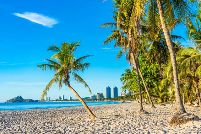 Beautiful tropical outdoor nature landscape of beach, sea and ocean with coconut palm tree at Hua hin city, Thailand