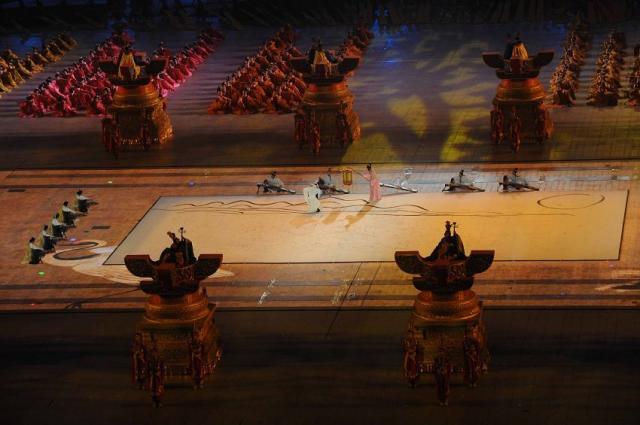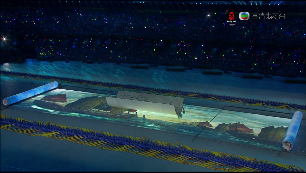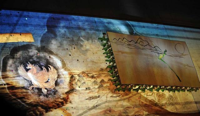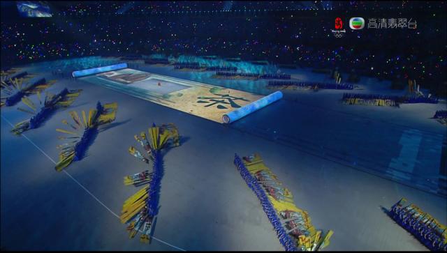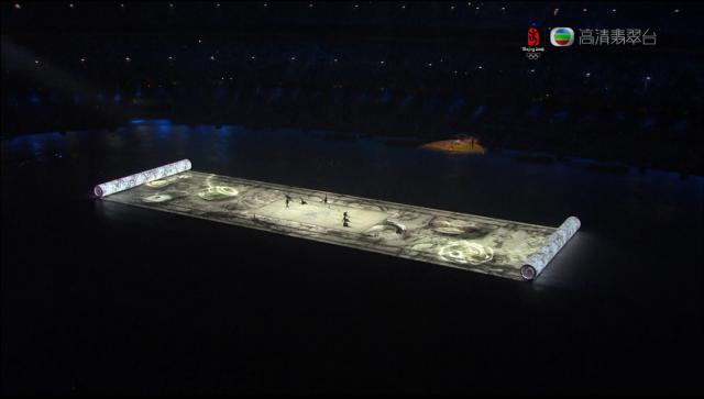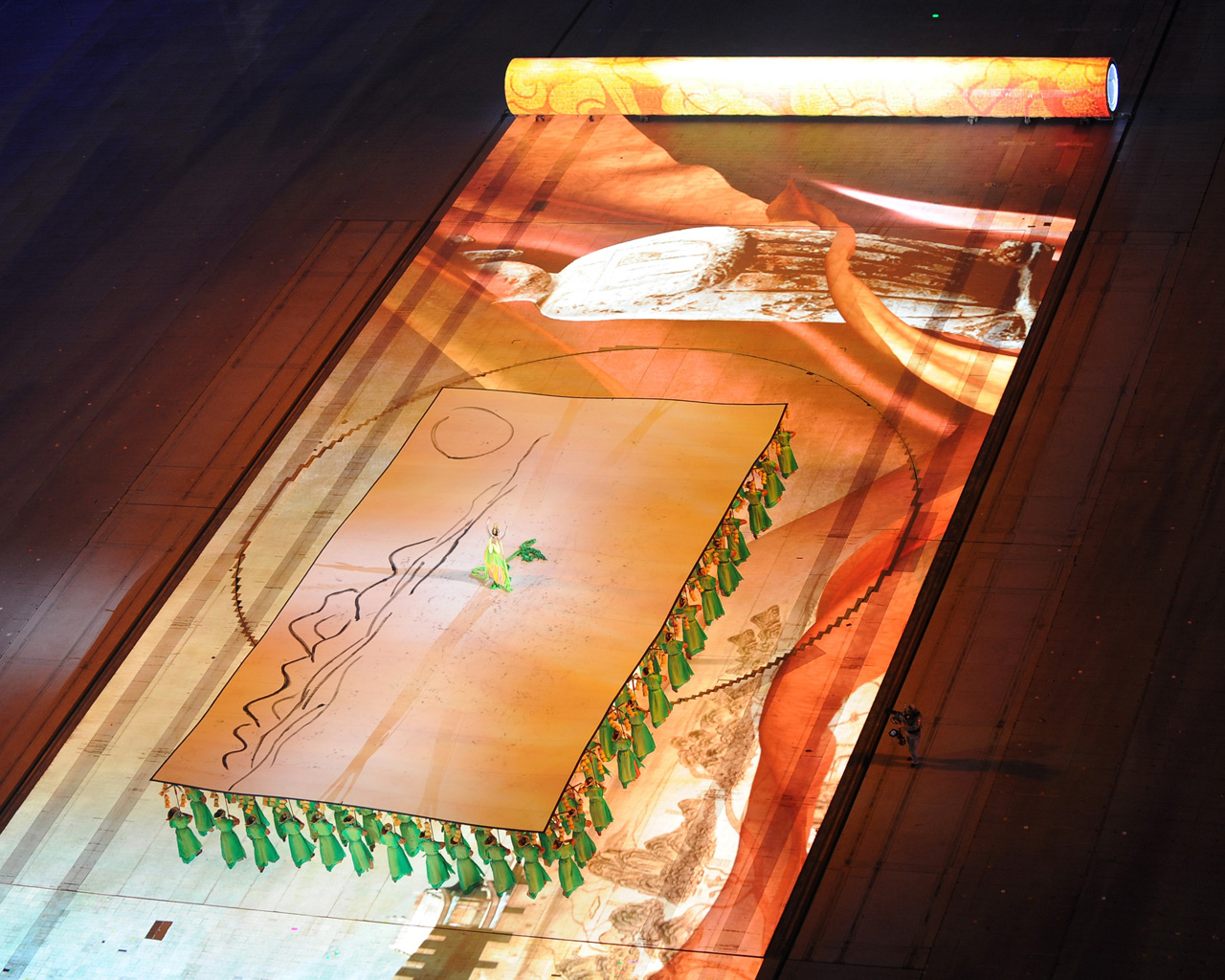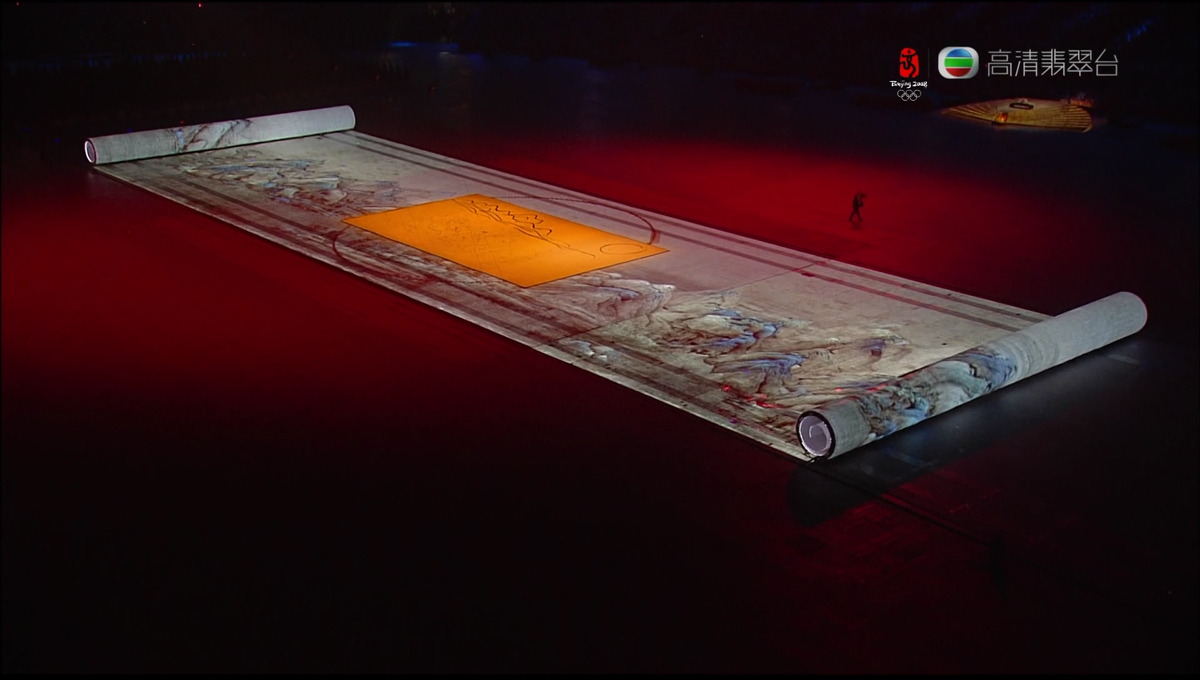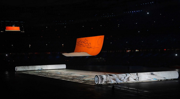 ม้วนกระดาษขนาดใหญ่ปรากฏกลางสนามพร้อมกับคลี่ออกอย่างช้าๆ และฉายภาพเครื่องถ้วยโบราณของจีน ส่วนตรงกลางของม้วนกระดาษเป็นผืนผ้าใบซึ่งมีนักแสดงที่แต่งชุดดำและทาหมึกไว้ทั่วตัวกลิ้งตัวไปมาเป็นรูปท้องฟ้า ภูเขา และดวงอาทิตย์ สื่อให้เห็นถึงการเขียนภาพด้วยหมึกจีน